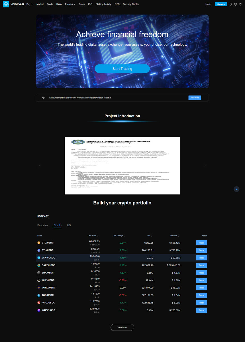 VISIONVAST Trading Center is headquartered at 30 HUDSON STREET, JERSEY CITY, NEW JERSEY 07302, United States. Its infrastructure has been tested in live markets since August 2017, with both an H5 browser client and mobile app engineered for throughput, low latency, and stable order matching. The platform serves a global user base and positions itself as an innovator in cryptocurrency trading and investment education.